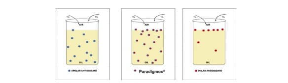 A presença desses 2 antioxidantes, BHT e propilgalato, bem como a presença de um quelante metálico são essenciais em vários aspectos da eficácia do produto. O primeiro aspecto é que devido à concentração adequada de antioxidantes no veículo, foi gerado um efeito sinérgico entre eles, ou seja, o efeito antioxidante de um potencializa o efeito do outro. Por sua vez, é importante conhecer intrinsecamente a química dos antioxidantes e seu mecanismo de ação; existe uma teoria totalmente aceita conhecida como 'The Polar Paradox'1 onde se conclui que antioxidantes polares (como o propilgalato) têm um melhor comportamento em ambientes apolares e antioxidantes apolares (BHT) têm um melhor comportamento em ambientes polares e que a adição de um antioxidante polar e um apolar cria um efeito binário que aumenta o efeito antioxidante. (Figura 2).
