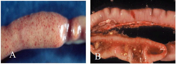 A espécie E. tenella parasita, por predileção, os dois cecos das aves, podendo atingir, também, porções vicinais do intestino. Nos casos mais leves da doença, tem-se petéquias (vermelhas ou roxas) dispersas na junção cecal sem espessamento de parede. Com o agravamento da doença, as petéquias se tornam mais numerosas e aparentes na serosa do ceco, a parede começa a se espessar, as vilosidades epiteliais se encurtam e ocorre perda de fluidos, bem como lesões profundas na mucosa (Figura 3) (Conway & McKenzie, 2007; Ito et al., 2004).