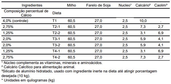 O estudo foi realizado em um delineamento inteiramente ao acaso, com quatro tratamentos: T1 - Tratamento controle, 4,0% de cálcio (Ca); T2 - 2,75% de Ca pela manhã às 8:00 horas, e 1,25% de Ca pela tarde às 16:00 horas; T3 - 2,0% de Ca pela manhã e 2,0% de Ca à tarde e T4 – 1,25% de Ca pela manhã e 2,75% de Ca à tarde, onde para o fornecimento da ração em cada unidade experimental, utilizou-se uma balança eletrônica Prix3f/P300100 – Toledo.