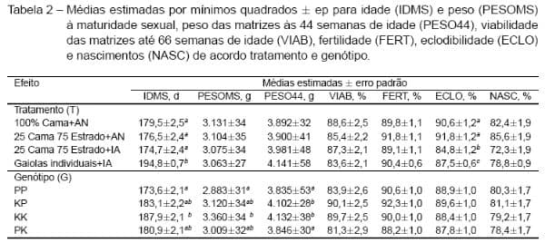 Os efeitos genéticos testados mostraram que o efeito da heterose foi significativo (P=0,0035) apenas para número de ovos de duas gemas, sendo negativo; isto é, aves cruzadas apresentam menor número de ovos de duas gemas do que aves puras, neste caso a redução foi de cerca de 20%.