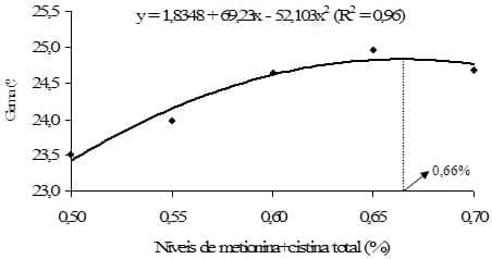A conversão alimentar foi influênciada de forma quadrática (P ≤ 0,001) pelos níveis de metionina+cistina na ração (Figura 3), em que a melhor conversão alimentar foi observada no nível de 0,60% dos aminoácidos sulfurados.
