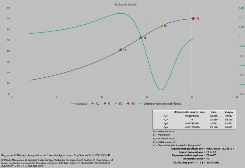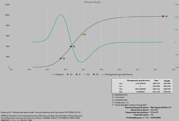 Podemos assegurar que a grande beleza da curva sigmoide está nessa “força de crescimento”, definida pelo produto da segunda derivada pela nova biomassa, que permite determinar os pontos F1, Fi, F2 e F3.