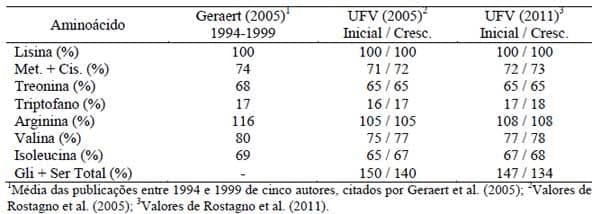 Tais resultados sugerem que, na fase inicial, o nível de glicina+serina deve ser controlado e, na fase de crescimento/final, deve-se levar em consideração os níveis dos aminoácidos isoleucina e leucina. A recomendação atual, para aplicação do conceito de proteína ideal em formulações de rações, seria a redução do nível proteico da ração, o que provoca a eliminação da sobra de aminoácidos essenciais e não essenciais. Quando necessário, devem ser suplementados aminoácidos industriais, como metionina, lisina e treonina para evitar deficiências (ROSTAGNO et al., 2003a).