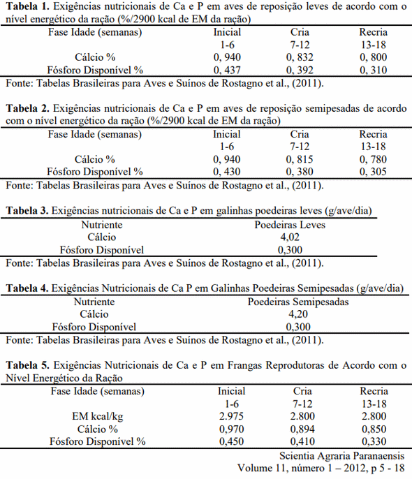 Rostagno et al., (2011) realizaram estudos através de uma série de experimentos de dose-resposta, associados a observações de comportamento de rebanhos comerciais em várias regiões do Brasil. Os pesquisadores estabeleceram níveis de nutrientes exigidos para aves, sendo apresentado nesta revisão os níveis de Ca e P em rações de galinhas poedeiras e matrizes reprodutoras em diferentes fases da vida e peso, cujo dados estão apresentados nas Tabelas 1, 2, 3 , 4, 5 e 6.
