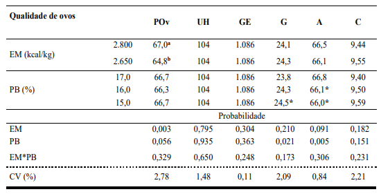 Tabela 3 – Qualidade de ovos (POv: peso de ovo, g; UH: Unidade haugh; GE: gravidade específica, g/cm3; G: gema,%; A: Albúmen,%; C: casca,%) de poedeiras semipesadas submetidas a diferentes níveis de energia metabolizável (EM) e proteína bruta (PB) na ração de 50 a 66 semanas de idade. Medias na coluna, seguida de letras desiguais diferem entre si pelo teste F (5%). *Medias na coluna (seguida de asterisco) diferem ao controle (17,0% PB) pelo teste de Dunnett (5%)
