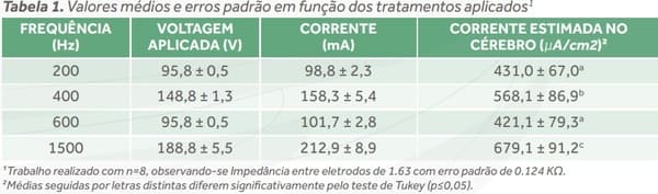 Todos os frangos foram submetidos individualmente, em duplicata, à sequência de quatro frequências (200, 400, 600 e 1500 Hz) associadas a diferentes voltagens (Tabela 1), utilizando onda quadrada em corrente alternada (com 50% duty cycle). Avaliou-se a tensão na cabeça usando multímetro com resolução de milésimos de volts (mV). Fez- -se também leitura da impedância entre os eletrodos através de ponte LCR à frequência de 1 KHz (Seoane et al., 2004), antes e após a passagem da corrente elétrica para verificar a variação pela possível interação do tecido com a corrente elétrica e também usar estas medidas para calcular a corrente elétrica na área de cérebro compreendida pelos eletrodos através da Lei de Ohm generalizada. Foi realizada a análise da variância para o modelo considerando os efeitos de frango e de tratamento, seguida pelo teste de Tukey. O software SAS (2012) foi utilizado para realização das análises.