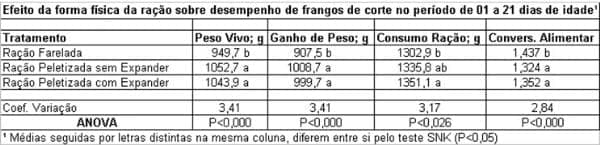 Esse trabalho demonstra que os frangos que consomem rações peletizadas, mesmo até os 21 dias de idade, já apresentam uma conversão alimentar melhor, no caso na ordem de 8%, em relação aos frangos alimentados com rações fareladas.
