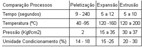 A tabela acima reúne valores indicados por diferentes fontes. De um modo geral, os valores sugeridos para a variável tempo nos processos de expansão e extrusão são bem mais parecidos do que na peletização. Isso se deve ao fato de que nesses processos são usadas temperaturas e pressões muito altas e, por conseguinte, o tempo precisa ser muito reduzido, pois, caso contrário, ter-se-ia um prejuízo enorme - de um modo especial, sobre os ingredientes mais sensíveis à temperatura como, por exemplo, as vitaminas, as enzimas e os aminoácidos.