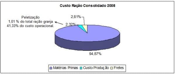 Na figura 03, esses custos médios são representados e divididos em custos de formulação (94,87%), custo operacional (2,32%) e custo do transporte (2,81%). Nos custos operacionais, abrimos o custo da peletização que representa, nesta empresa, aproximadamente, numa fábrica equivalente a um abate de 100 mil frangos/dia, R$ 7,10/ton e R$ 6,20/ton para uma unidade equivalente a um abate de 350 mil aves.