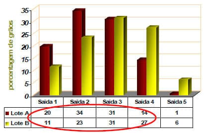 As três amostras de 30 kg foram submetidas à passagem pela mesa gravitacional, na qual dispunha de cinco saídas: na primeira se concentravam os grãos menos densos e na última os grãos mais densos. Todas as regulagens foram previamente fixadas. Após a limpeza dos grãos, foram coletadas amostras de 1 kg de cada saída para posterior avaliação.