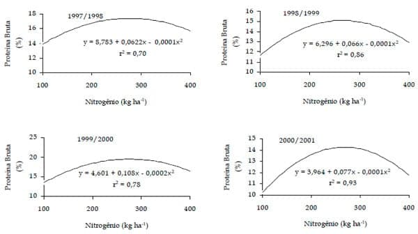 Os resultados referentes aos teores de proteína bruta (PB) nas lâminas foliares variaram em função das doses de N com resposta quadrática nos diferentes períodos (Figura 4). Observa-se que os valores máximos de PB nas lâminas foliares foram 15,1; 17,5, 14,2 e 19,4% correspondendo respectivamente às doses estimadas de 266, 278, 267 e 274kg/ha/ ano de N nos períodos chuvosos de 1997/1998, 1998/1999, 1999/2000 e 2000/2001. Estes teores de PB, segundo MINSON (1984), são mais que suficientes para uma adequada fermentação dos microorganismos ruminais para garantir a mantença dos animais, sendo o valor preconizado de 7%.