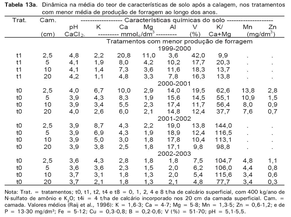 Os valores de saturação por bases são bastante dinâmicos e podem diminuir intensamente (Tabela 17a, no Anexo) quando não há uso suficiente de calcário, embora se possa obter produções de forragem consideradas médias para o capim-braquiária em até 8% de saturação por bases (t0), com pH de 3,6, na camada de 0 a 2,5 cm (Tabela 13a anexa). Mas, nessas condições e abaixo delas, como a variabilidade espacial do solo é grande, pode ocorrer morte de plantas por falta de cálcio e/ou Mg.