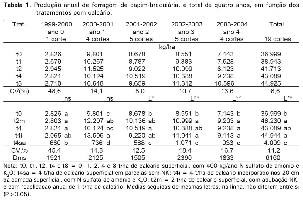 Verificou-se que, na soma de quatro anos, os valores de produção para 8 t/ha em superfície, ou 4 t/ha incorporados ou 2 t/ha em superfície com reaplicação anual de 1 t/ha de calcário, foram semelhantes (Tabela 2). Embora a incorporação do calcário possa atrasar a produção de forragem nos 30 dias iniciais, tempo para restabelecimento da forrageira, poderá gerar produções maiores do que as pastagens com calcário aplicado na superfície, no primeiro ano, porém, por vezes de forma não A queda de produção de forragem com o decorrer dos anos, quando se utiliza doses elevadas de nitrogênio, também foi verificada por Abruña et al. (1964), em trabalho com capim-napier (Pennisetum purpureum), capimguiné (Panicum maximum) e capim-pangola (Digitaria decumbens), em Porto Rico. Esses autores constataram queda progressiva da produção de forragem sem o uso de corretivo de acidez do solo após a aplicação inicial.
