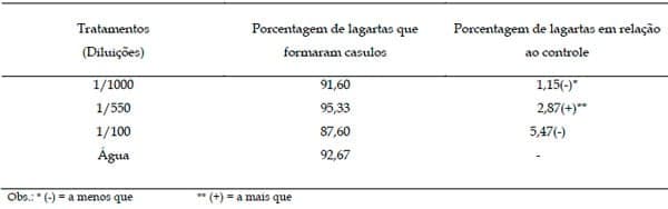 Pode-se notar que no tratamento com diluição intermediária (1/550), a porcentagem de lagartas que formaram casulos foi 2,87% maior que o controle. Não sendo possível afirmar que este resultado corresponda a um efeito de tratamento.