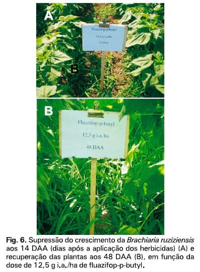 Ao se utilizar genótipos convencionais, como por exemplo, o híbrido Aguará 4, a aplicação de subdoses de herbicidas graminicidas, em pós-emergência, é vantajosa para o sucesso do consórcio, evitando a competição da gramínea forrageira com o girassol (Brighenti et al., 2008a). A aplicação é feita normalmente no estádio fenológico V6 do girassol e plantas de B. ruziziensis com 2 a 3 perfilhos, com altura média de 15 a 20 cm. Nesse caso, os herbicidas tepraloxydim (10 g i.a./ha) (Fig. 5) ou mesmo o fluazifop-p-butyl (12,5 e 25,0 g i.a/ha) (Figs. 6 e 7, respectivamente) são graminicidas potenciais na supressão da B. ruziziensis, proporcionando redução no crescimento inicial das plantas, porém sem causar a morte da forrageira, e permitindo a recuperação posterior da pastagem.