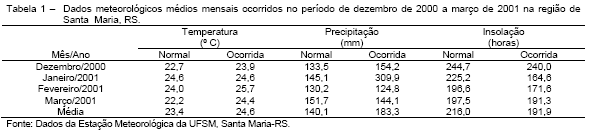 Tabela 1 - Dados meteorológicos médios mensais ocorridos no período de dezembro de 2000 a março de 2001 na região de Santa Maria, RS.