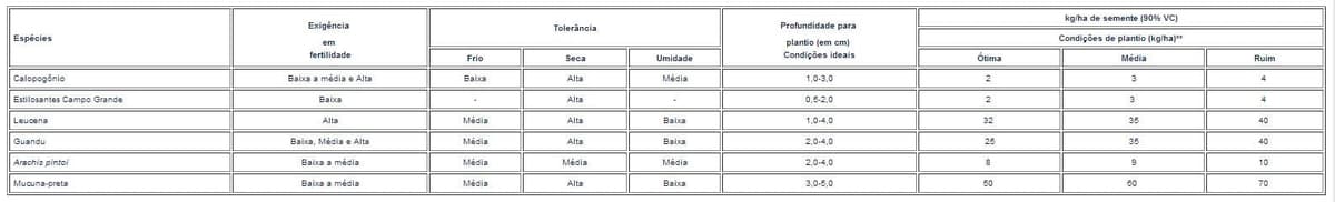 Obs.: No caso de plantio aéreo, a quantidade de sementes recomendada por hectare deverá ser aumentada em 50%. Quando o plantio for para solos muito arenosos, pode-se aumentar a profundidade recomendada