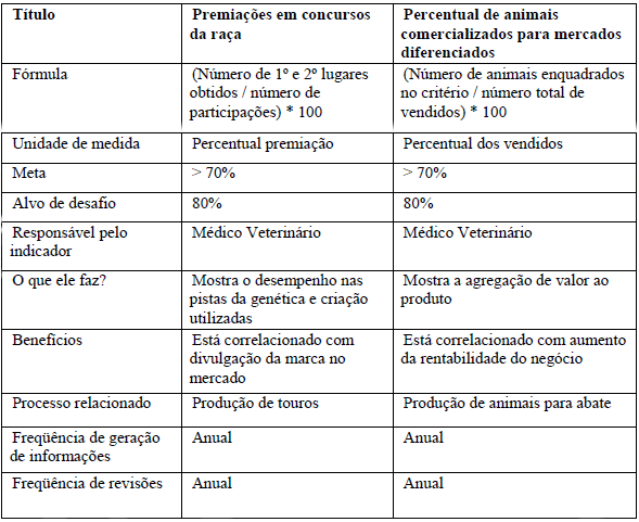 Os indicadores da perspectiva clientes para o macroprocesso produção de touros estimam valores de 50 e 60% (meta e alvo) para retenção de clientes e 20 e 25% (meta e alvo) para novos clientes. O valor diferencial de 15 a 30% fica para a faixa de clientes eventuais, os quais adquirem touros em anos alternados, tanto por optarem por outros fornecedores (busca por novas linhagens), como por possuírem demanda diferenciada em cada ano, normalmente devido ao tamanho do rebanho, o que influi no percentual de renovação dos reprodutores.