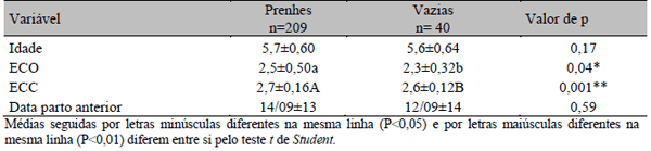 Tabela 4. Idade em anos, escore de condição ovariana (ECO), escore de condição corporal (ECC) e data de parto no ano anterior de vacas prenhes e vazias ao final da temporada reprodutiva