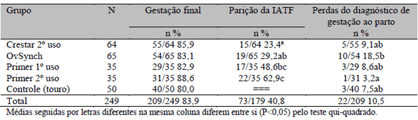 A taxa de parição média, resultante da IATF, foi de 40,8%, com diferença entre grupos (Tab. 2). O tratamento à base de Primer 2º uso mostrou-se superior (62,9%), sem diferir do Primer 1º uso (48,6%), enquanto o tratamento Crestar 2º uso com ½ dose de valerato mostrou o pior resultado (23,4%), sem diferir do tratamento OvSynch (29,2%), e este não diferiu do Primer 1º uso.