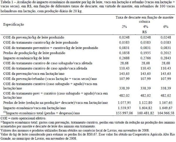 As perdas de produção (descarte de leite de animais em tratamento, diminuição na produção, desvalorização e morte de matrizes), por kg de leite, foram de R$0,1858; R$0,1935 e R$0,2012 kg/leite (Tabela 1), para as taxas de descarte de 2%, 4% e 6% respectivamente. As diferenças foram devidas à maior desvalorização de matrizes.