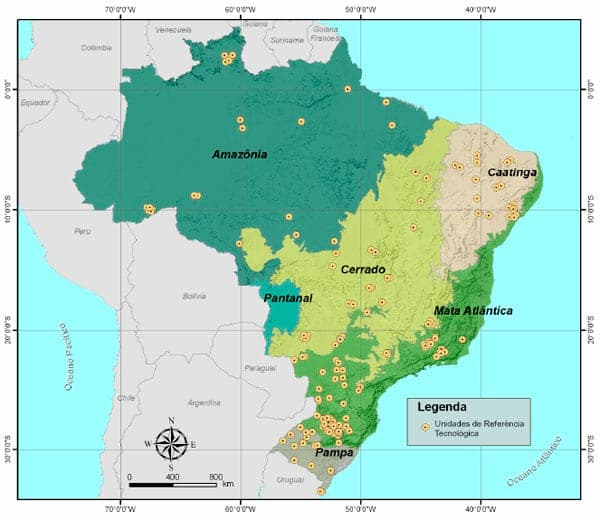 Dispondo de uma rede dessa magnitude, em termos de URT's, visualizar a distribuição dessas fazendas no espaço geográfico brasileiro torna-se de suma importância para o fornecimento de um mecanismo de gerenciamento e planejamento de ações futuras, bem como de compreensão da interação entre elas no contexto da diversidade edafo-climática do país e das questões sócio-econômicas envolventes. Para o tratamento e visualização da distribuição geográfica das unidades iLPF utilizou-se um Sistema de Informações Geográficas (SIG), o qual contém ferramental com diversas aplicações na agricultura [2], pois se baseia em conceitos de geociências e tecnologia da informação para a reunião de diversas funções lógicas, matemáticas e de estatística espacial para a resolução de questões voltadas para o subsídio ao planejamento e tomada de decisões no âmbito territorial.