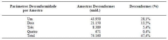 A qualidade do leite produzido no Brasil frequentemente tem se mostrado em desacordo com os padrões regulamentados pela legislação vigente (NERO et al., 2005; ZANELLA et al., 2006). Do total de amostras analisadas, 28,1% estavam desconformidade em um dos parâmetros estabelecidos pela IN62, 13,5% em dois parâmetros, 5,4% em três, 0,4% em quatro, perfazendo um total de 47,4% das amostras desconformes com a legislação (Tabela 3). Este é um dado preocupante, pois evidencia que a real qualidade do leite produzida no Brasil ainda está longe do padrão regulamentado.