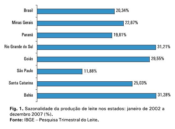 A sazonalidade da produção de leite no Brasil é de aproximadamente 20%. Entre os estados da Federação, São Paulo apresentou a menor sazonalidade, 11,88%, e a Bahia foi o estado que apresentou a maior variação no volume de leite, 31,28%.