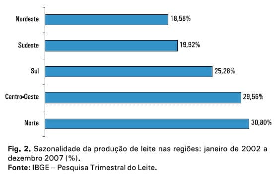 Entre as cinco regiões do País, o Nordeste apresentou a menor sazonalidade da produção de leite, com variação de 18,5% e em seguida a região Sudeste com 19,9%. A região de maior sazonalidade é o Norte do país, com queda de 30,8% do volume de leite no mês de menor produção (Fig. 2).