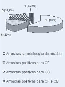 Das 48 amostras de alimentação analisadas, 22 (45,83%) apresentaram resíduos, sendo 15 (31,25%) positivas para OF, seis (12,50%) para CB e uma (2,08%) para ambos praguicidas. Para as amostras de água, seis (37,50%) apresentaram resíduos para OF e nenhuma amostra apresentou resíduos para CB.