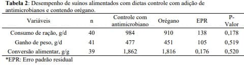 Quando comparados o tratamento controle com adição de antimicrobianos com os que utilizaram orégano, também não houve diferença (P> 0.05; Tabela 2). Importante ressaltar que, dietas contendo orégano possuem um forte potencial de efeito antioxidante e uma possível ação antimicrobiana (2).