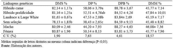 Para o parâmetro digestibilidade não foi observada diferença estatística entre as linhagens para os índices de digestibilidade da proteína e da matéria mineral (Tabela 4). Entretanto, os resultados indicam que animais sem seleção apresentaram o pior índice de digestibilidade para matéria seca (P<0,05). Para a digestibilidade do fósforo o grupo sem seleção também apresentou resultados inferiores aos demais (P<0,05), sendo que os animais do grupo melhorado para carne demonstraram melhor (P<0,05) aproveitamento do fósforo em relação ao grupo Large White x Landrace, mas não diferiram dos animais híbridos selecionados para prolificidade (Tabela 4).