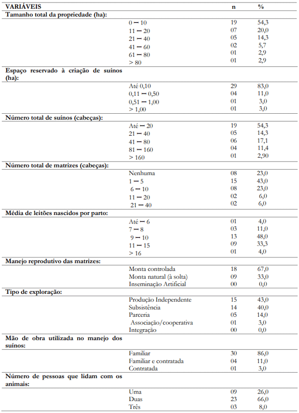 A caracterização da suinocultura local poderá fornecer subsídios para o desenvolvimento da atividade e estratégias de enfretamento dos possíveis fatores limitantes. Sendo assim, objetivou-se caracterizar a suinocultura de Ceres-GO nos aspectos de produção, manejo, alimentação e sanidade. A pesquisa foi desenvolvida mediante aplicação eletrônica de questionário semiestruturado entre suinocultores. Os participantes responderam a questões socioeconômicas e referentes à suinocultura de forma anônima. Os dados foram submetidos à análise descritiva com ênfase na distribuição de frequência. Participaram efetivamente da pesquisa 35 suinocultores. Observou-se predominantemente suinocultores do sexo masculino (77,1%) com idade entre 49 e 64 anos (60,0%), com ensino fundamental concluído (42,9%). Para 80,0% dos participantes a suinocultura não foi elencada como principal atividade desenvolvida. Predominaram propriedades que tinham área de até 10 hectare (ha) (54,3%), com rebanho de até 20 suínos (54,3%). A força de trabalho familiar foi predominantemente aplicada (86,0%), e a dieta dos suínos composta por ração associada a outros tipos de alimentos (60,0%). A origem de água fornecida aos suínos era proveniente, principalmente, de poços artesianos (43,0%). As paredes das instalações eram construídas em alvenaria (51,0%) com piso de concreto (94,0%). A assistência técnica nas criações foi escassa (3,0%) e o uso de medicamentos/vacinas foi frequentemente verificado. Constatou-se a presença de outras espécies coabitantes em 26,0% das propriedades e as carcaças dos animais tradicionalmente eram destinadas ao consumo familiar com venda do excedente, principalmente no próprio estabelecimento. A suinocultura em Ceres-GO apresentou perfil de subsistência, sendo atividade que contribui com a segurança alimentar e diversificação da renda das famílias. A ausência do acompanhamento profissional é limitante e imbuem riscos sanitários à saúde pública e aos suínos.