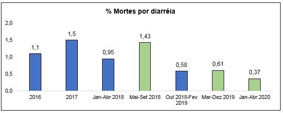 Durante o período de maio a setembro de 2018, a retirada do manejo preventivo se reflete no aumento da mortalidade por diarreia em comparação ao início do ano, porém semelhante a média no ano anterior (2017). Após setembro de 2018, quando as matrizes presentes na maternidade são as que consumiram probiótico durante todo o período de gestação, a incidência de mortalidade por diarreia cai. O uso do probiótico nas rações de matrizes fez a incidencia de mortalidade por diarreia, antes da avaliação, cair de 1,3% (média ponderada de 2016 até início da avaliação) para 0,7% (média poderada após a avaliação até abril de 2020).