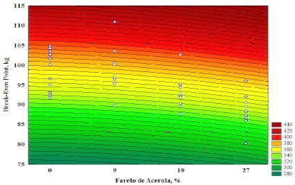 Figura 1 – Interação níveis de farelo de acerola x break-even point sobre o custo operacional total de produção.