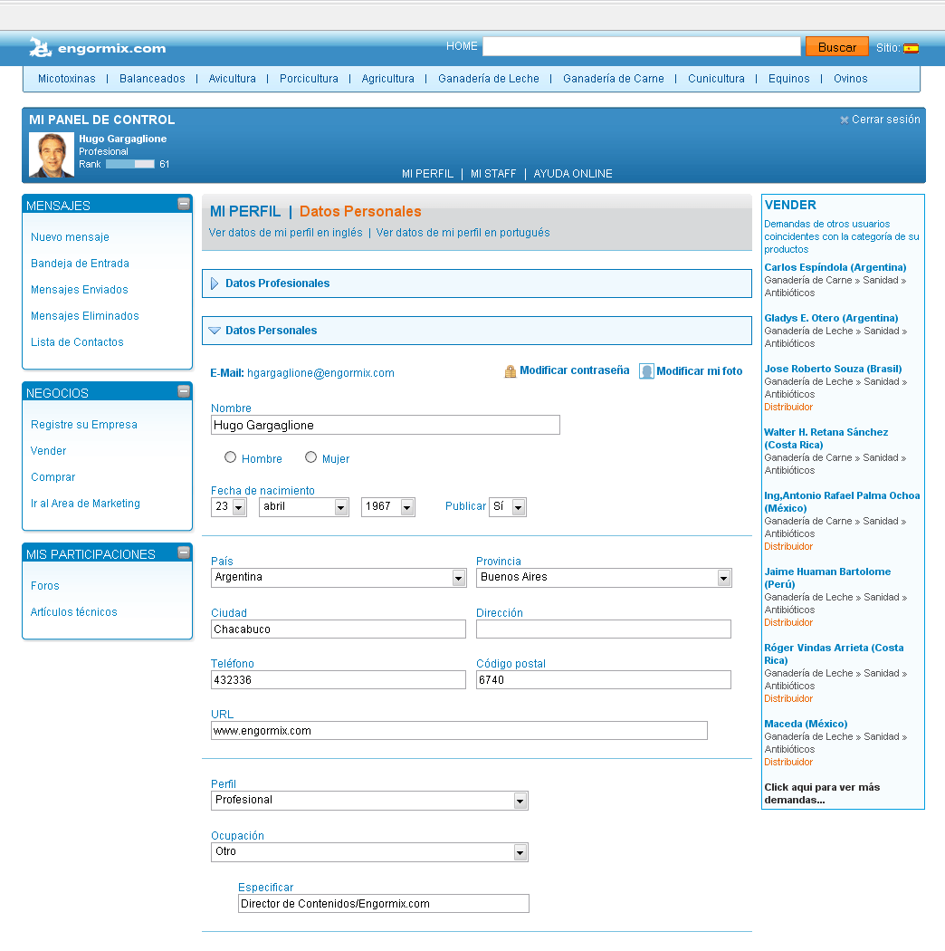 Com outro design e novas possibilidades de acesso às informações, entrou em funcionamento o novo Painel de Controle, utilizado pelos usuários do Engormix.com. Além do novo desenho, as modificações e melhoras desenvolvidas pelos departamentos de Sistemas e Desenho e Planificação, têm o objetivo de permitir ao usuário melhor qualidade no acesso e visualização dos seus dados pessoais e profissionais (Meu Perfil); com alterações significativas também no que diz respeito ao link que abriga o grupo de funcionários da empresa (Minha Equipe), suas atividades no Engormix.com e as pariticipações em fóruns técnicos e/ou publicação de artigos técnicos (Minhas Participações, localizado na margem esquerda da tela).
