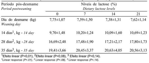 Apesar da diferença absoluta entre os tratamentos, quanto ao peso médio dos leitões ter aumentado do 14o dia após o desmame até o 35o dia, o nível de significância desta diferença reduziu no mesmo período. No período total, observou-se que os leitões que receberam as dietas com 7 e 14% de lactose ganharam 1,20 e 1,59 kg a mais de peso, respectivamente, até o final da fase de creche, do que aqueles que receberam a dieta sem lactose (Tabela 5).